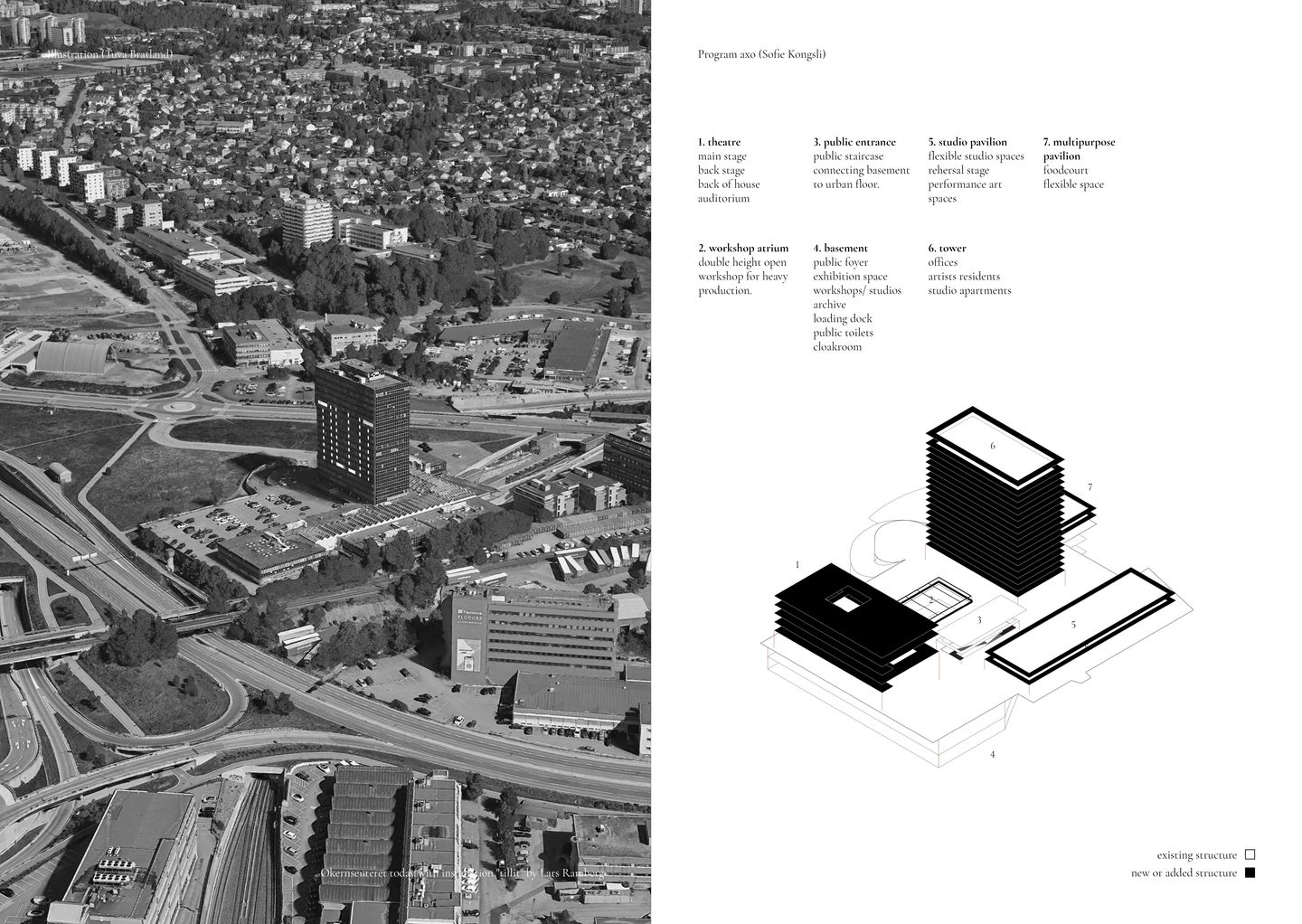 I vårt forslag til en ny hovedscene viderefører vi essensen av Rambergs prosjekt og ideer om den urbane utviklingen av Økern. Vi ønsker å skape et kulturelt samlingspunkt i Økernsenteret som ivaretar Økerns nåværende identitet og som bidrar til å motvirke gentrifisering. Det nye knutepunktet bruker stedets industrielle identiteten som en kvalitet, og etablerer et senter som er like mye et sted for kulturproduksjon som for kulturkonsumering.